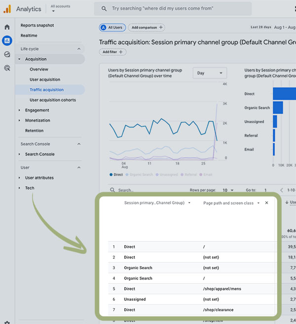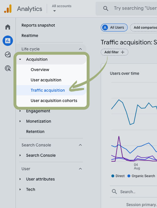 You can also look at the data in the reverse way by clicking on “Acquisition” and then “Traffic acquisition”.