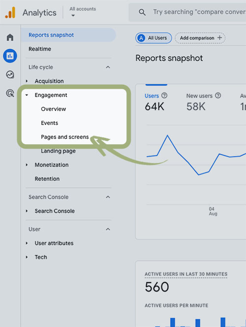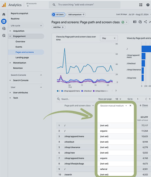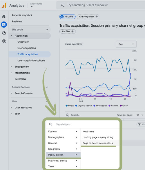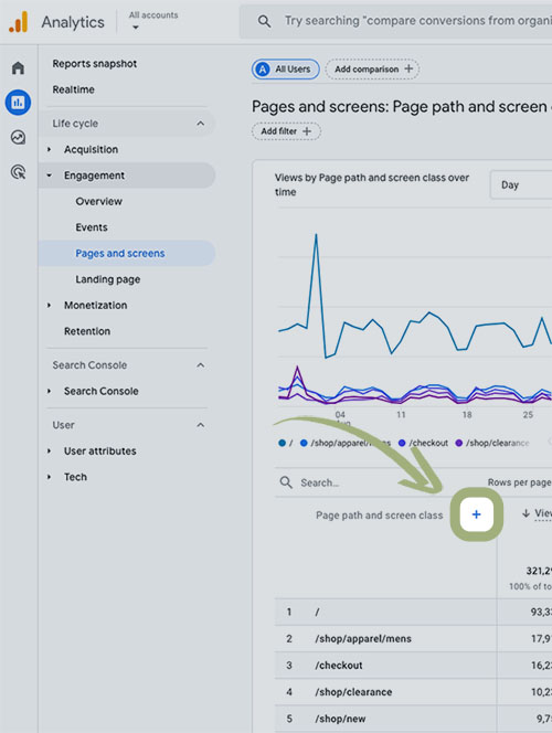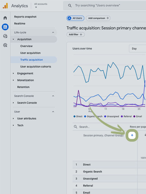 Where is your traffic coming from? Possible sources include direct visits, organic search, referral links, organic social (from social media), paid social (ads), paid search (Google ads), or paid display (banner ads).There are multiple ways to look at traffic data.1. You can add a “dimension” in the “Engagement” -> “Pages and screens” report by clicking this + symbol.