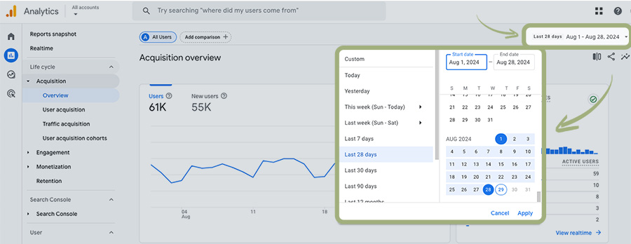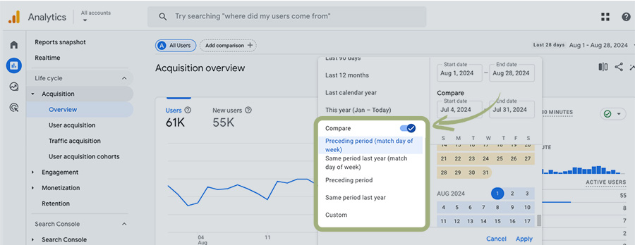 To compare date ranges, scroll down through the date ranges on left and click the toggle next to Compare. Select one of the default date ranges or make a custom one. When you’re done, click Apply to see the comparison.