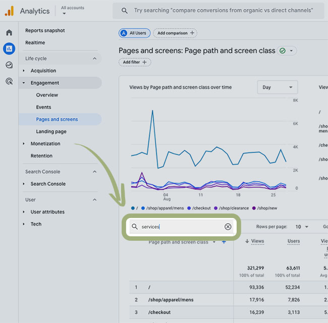 3. Type in the page path in the search box. For example, if your “Services” page is located at beaconfuneralhome.com/services, you would type in “services”.
