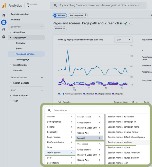 2. Next, click “Traffic source”, then “Manual”, then “Session manual medium”.